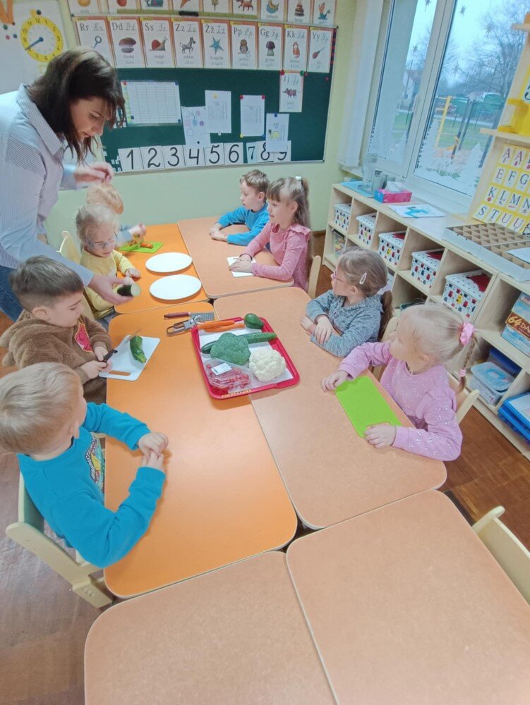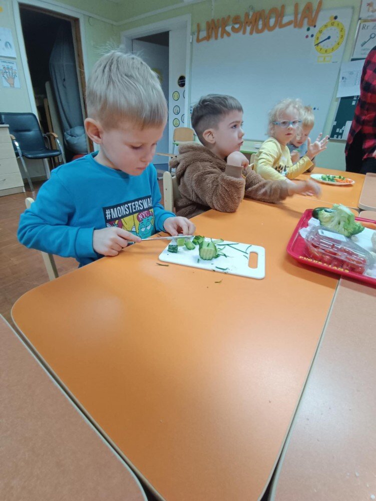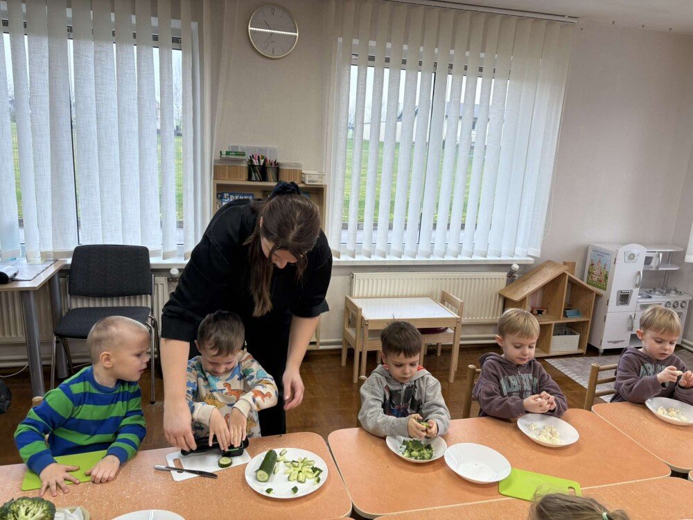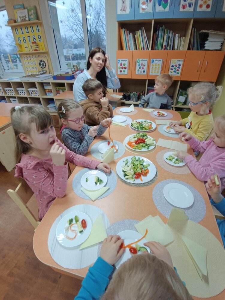 Sausis – mėnuo, kuomet mūsų organizmui pradeda trūkti per vasarą sukauptų vitaminų, prasideda ligų sezonas. Norint išlikti sveikiems, būtina ne tik daug judėti, bet ir sveikai maitintis. Drauge su visuomenės sveikatos priežiūros specialiste Vaida Zaueriene išsiaiškinome, kad svarbu valgyti daug daržovių, nes jose esantys vitaminai bei skaidulos padeda vaikams augti sveikiems ir žvaliems. Vaikai apžiūrėjo mokytojos bei sveikatos specialistės atneštas daržoves, drauge aptarė kiekvienos iš jų spalvą, naudą, skonio ypatumus. Vėliau jas plovė, smulkino, komponavo lėkštėje bei serviravo patį sveikų vaišių stalą. Akivaizdu, kad pačių paruoštos ir estetiškai patiektos daržovės vaikams žymiai patrauklesnės ir skanesnės, nes beveik visos vaišės buvo suvalgytos. Juk kiekvienam maga paragauti morkų gyvatėlių, cukinijų vikšrelių ar agurkų griežinėlių apibarstytų brokolių pabarstukais…