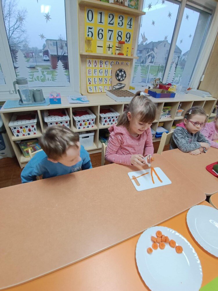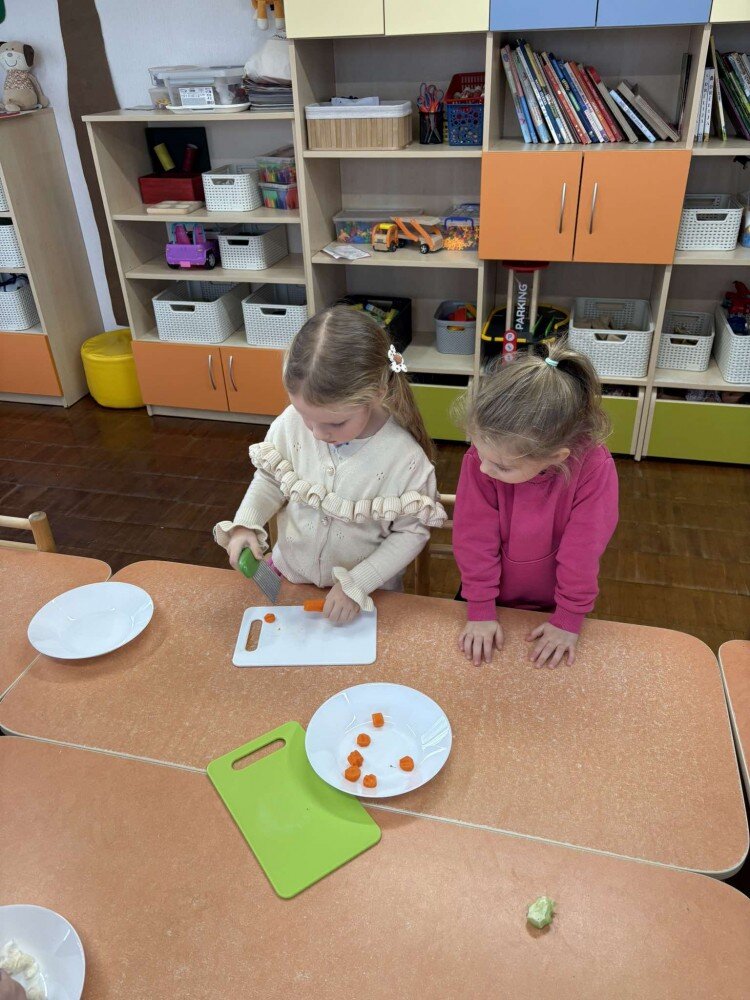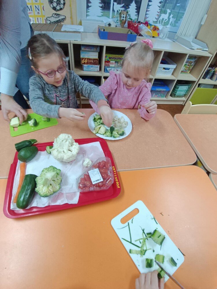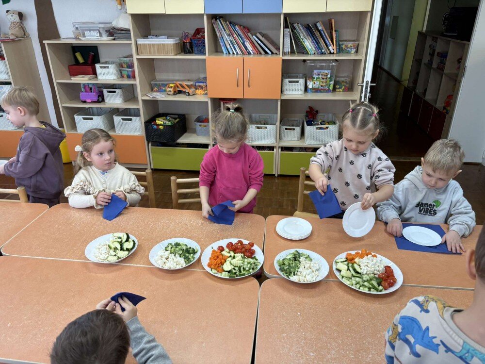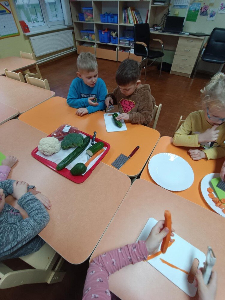 Sausis – mėnuo, kuomet mūsų organizmui pradeda trūkti per vasarą sukauptų vitaminų, prasideda ligų sezonas. Norint išlikti sveikiems, būtina ne tik daug judėti, bet ir sveikai maitintis. Drauge su visuomenės sveikatos priežiūros specialiste Vaida Zaueriene išsiaiškinome, kad svarbu valgyti daug daržovių, nes jose esantys vitaminai bei skaidulos padeda vaikams augti sveikiems ir žvaliems. Vaikai apžiūrėjo mokytojos bei sveikatos specialistės atneštas daržoves, drauge aptarė kiekvienos iš jų spalvą, naudą, skonio ypatumus. Vėliau jas plovė, smulkino, komponavo lėkštėje bei serviravo patį sveikų vaišių stalą. Akivaizdu, kad pačių paruoštos ir estetiškai patiektos daržovės vaikams žymiai patrauklesnės ir skanesnės, nes beveik visos vaišės buvo suvalgytos. Juk kiekvienam maga paragauti morkų gyvatėlių, cukinijų vikšrelių ar agurkų griežinėlių apibarstytų brokolių pabarstukais…