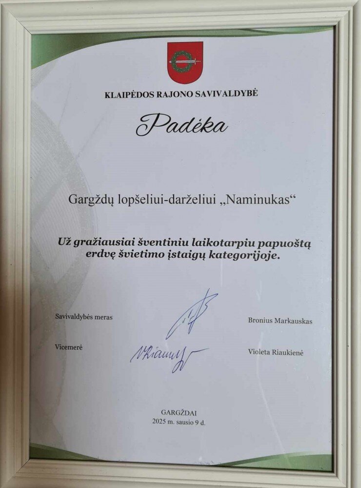 Klaipėdos rajono savivaldybės skelbtame konkurse „Gražiausiai papuoštos įstaigos šventiniu laikotarpiu“  Gargždų lopšeliui-darželiui „Naminukas“ PADĖKA  už gražiausiai šventiniu laikotarpiu papuoštą erdvę švietimo įstaigų kategorijoje.
