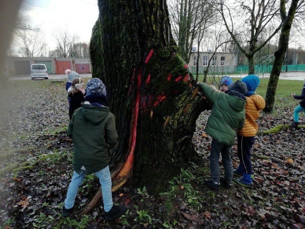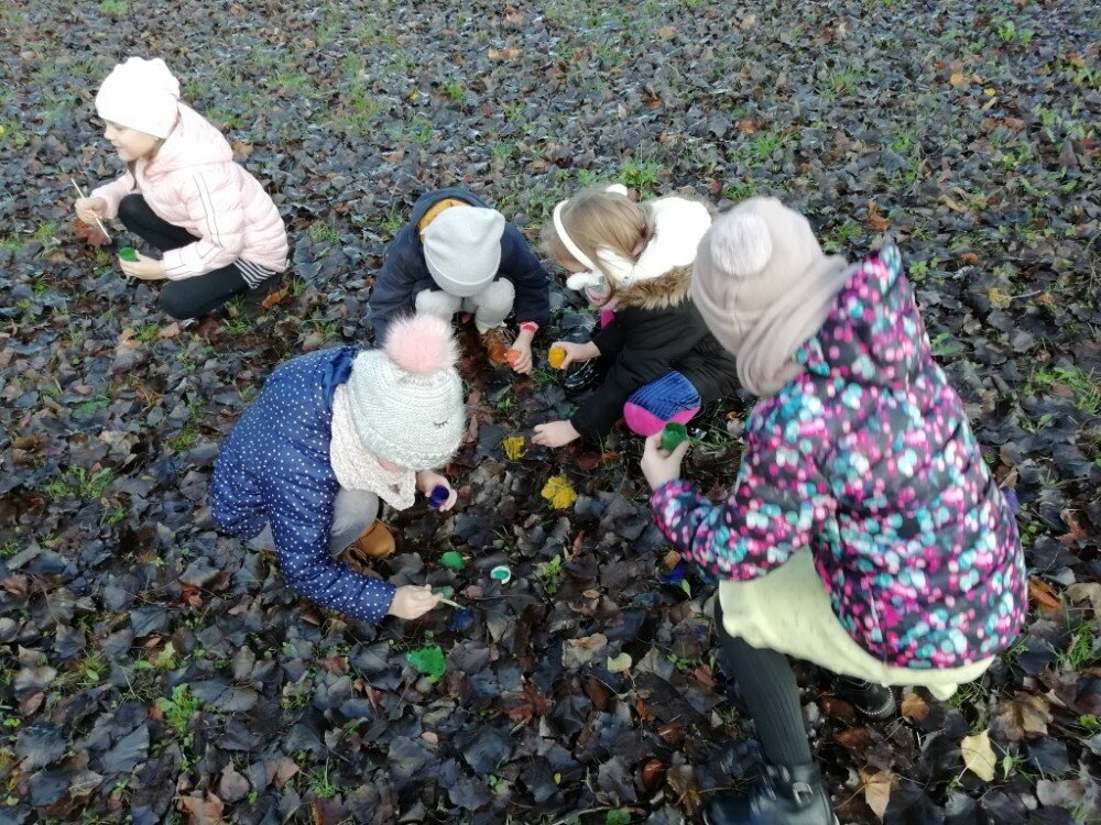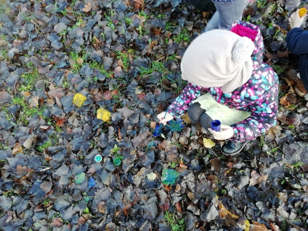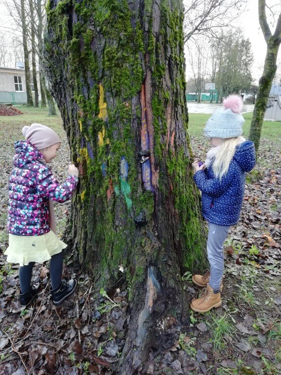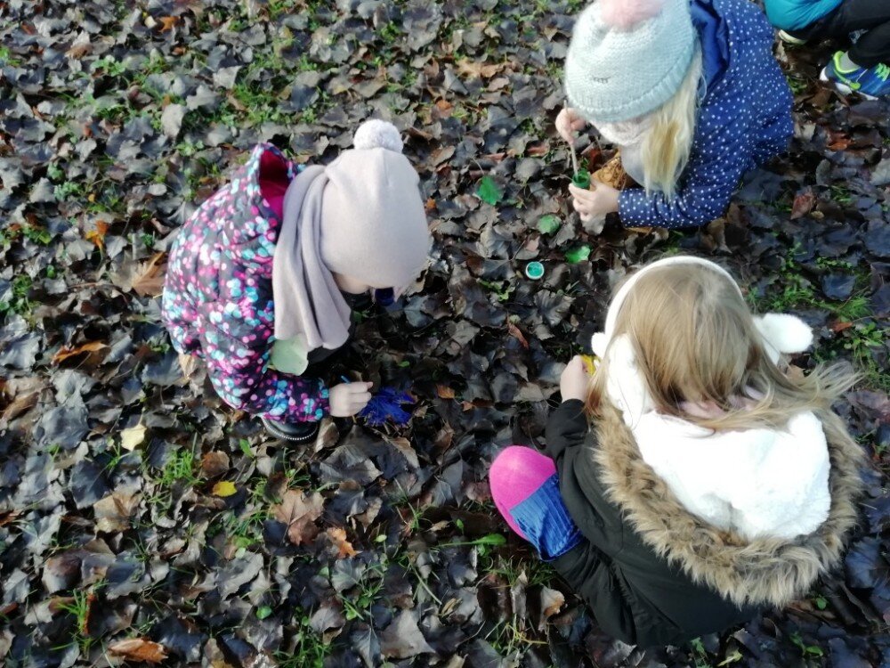 Aktyvi veikla lauke „NUSPALVINK LAPKRITĮ“. Ėjome į parką stebėti lapkričio mėnesio rudens. Pastebėjome, kad nukritę lapai prarado savo ryškias spalvas, tapo tamsiai rudi. Aptarėme, kodėl taip nutiko (pradėjo pūti). Kad rudeniui nebūtų liūdna, nusprendėme pralinksminti jį nuspalvinę lapus ryškiomis spalvomis (guašu). Vaikai spontaniškai sugalvojo, kad ir medžiai gali pasipuošti spalvomis.
