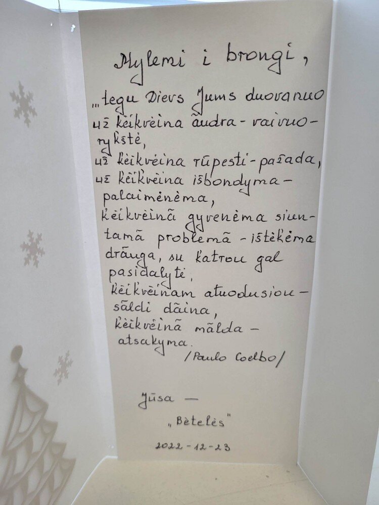 Dėkavuojam ož padrosėnančius ė palaikončius žodius, katrei paded drosesnes žingsnes keliautė i prieki ė mokīteis naujū dalykū. Už saugoma jausma ė korama abiposi pasėtėkėjima. Už bėndrīstė ė kelione kartu bėndrū tėkslū link! Jaukiū, gražiū ė prasmingū Šv. Kaliedū!