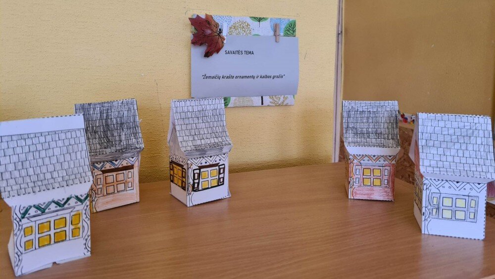 Teminės savaitės „Žemaičių krašto ornamentų ir kalbos grožis“ metu vaikai susipažino su savo šeimos išlikusiais senais žemaitiškais rakandais, klausėsi žemaičių kalbos, mokėsi patarlių, mįslių žemaičių tarme, tėvai įsitraukė į kūrybinį procesą, stiprėjo ugdytinių ryšiai su tėvais, seneliais, artimaisiais. Kūrybinių darbų paroda papuošė Dovilų etninės kultūros centrą, vėliau kūrybiniais darbais džiaugsimės įstaigoje.