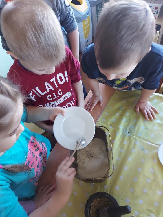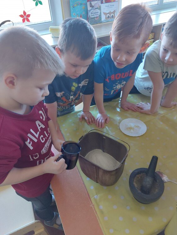 Šios savaitės temos ,,Mugėje” apie amatus įtvirtinimas, duonos gamyba. Vaikai susipažino su kepėjo amatu, aptarėme iš ko gaminama duona, kokių rūšių būna, kokia vaikų mėgstamiausia ir kodėl sveika ją valgyti. Su vaikais sužinojome duonos receptą, svėrėme, matavome, grūdome produktus. Sudėjome į duonkepę. Paskui ragavome. Buvo skani pirma mūsų duonelė :). Ačiū Smiltės mamai už duonkepę ir kitus priedus, Vaidoto mamai už sviestą ir sūrį.