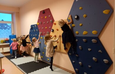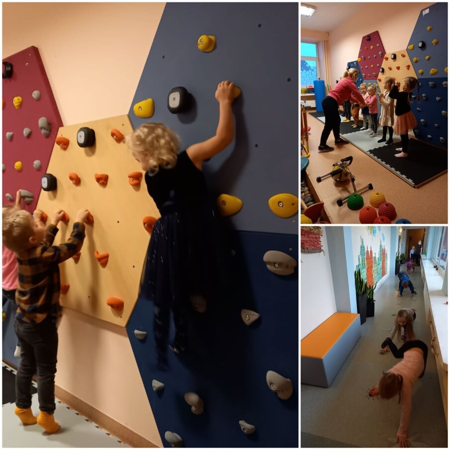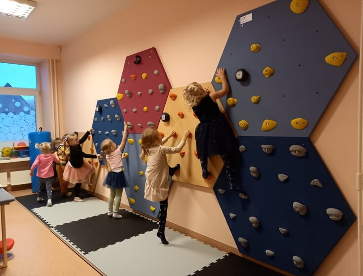 Įsigytos priemonės iš sporto projekto: interaktyvi laipiojimo sienelė, paspirtukai, masažiniai kamuoliukai.